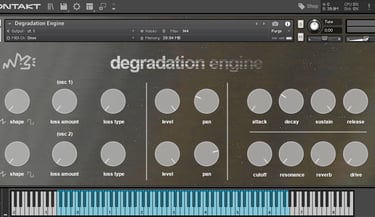degradation engine works very similarly to a regular subtractive synth - you get your filter, an ADSR, a mixer, and some handy effects. what sets it apart is its two oscillators, which each have two knobs controlling "loss".